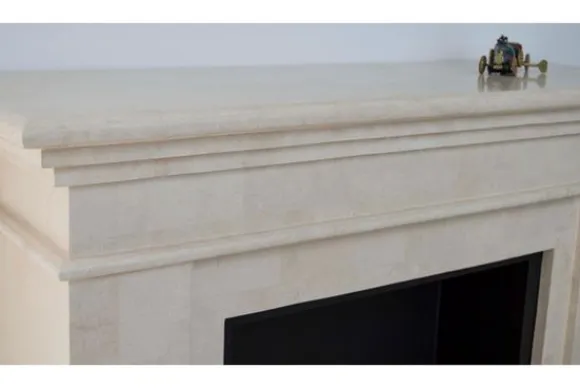 Deze haard wordt standaard uitgevoerd met een schouw van wit gepolijst natuursteen en elektrische inzethaard Lucius.