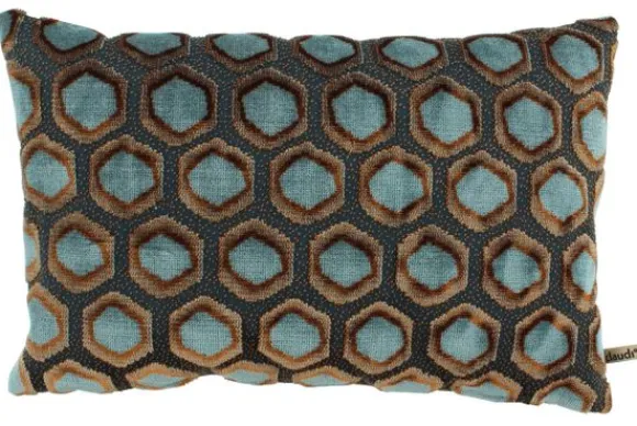 De stof is rijkelijk voorzien van een grafisch patroon met zeshoekige vormen, geweven in een intrigerend samenspel van koperbruin, diepblauw en aqua. De 3D-structuur in fluweelachtige stof zorgt voor een tactiele ervaring, terwijl de koperaccenten subtiel fonkelen zodra het licht erop valt.