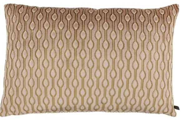 Het kussen is versierd met een geometrisch patroon van langgerekte ovale vormen die zich herhalen in een verticale flow. De zachte rozetint loopt subtiel over in goudachtige accenten, waardoor een verfijnde kleurverloop-effect ontstaat dat het licht prachtig vangt en weerkaatst. Het patroon heeft een fluweelachtige glans en geeft het kussen een luxueuze en bijna art deco-achtige uitstraling.
