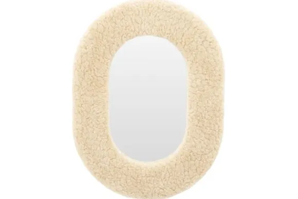 De spiegel heeft een unieke omlijsting van teddy-achtig textiel dat niet alleen comfortabel oogt, maar ook een gezellige sfeer creëert.