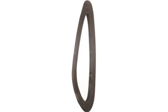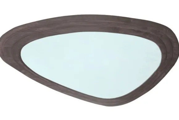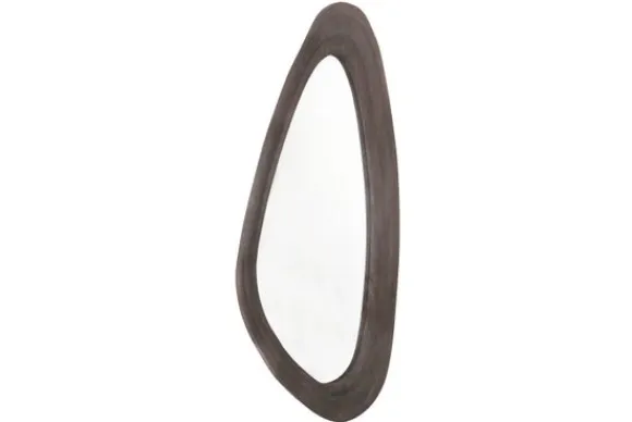 Spiegel Santin van het merk PTMD toont een organische, asymmetrische vorm met een donkere houten omlijsting.