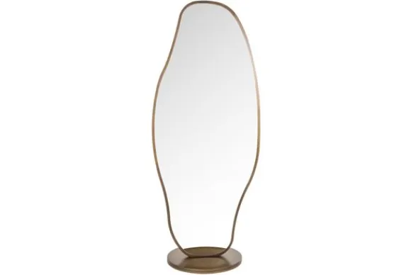 Spiegel Jalyce 213503 van het merk Richmond Interiors is een waar kunstobject met een vloeiende, organische vorm die direct in het oog springt. De asymmetrische omlijsting in warm goud geeft een tijdloos en elegant karakter, terwijl de robuuste voet zorgt voor een stijlvolle balans tussen design en functionaliteit.
