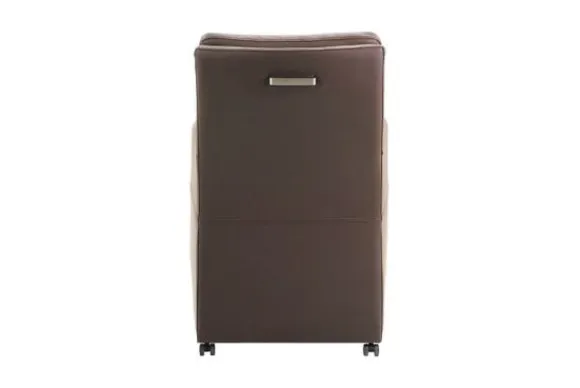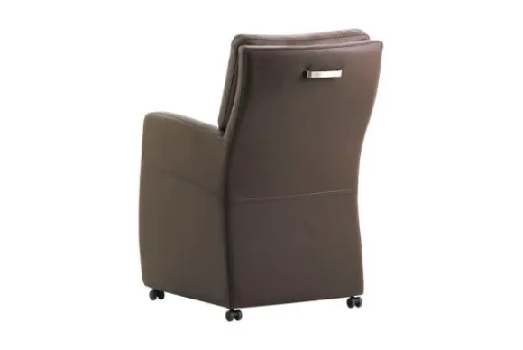 Deze stoel wordt standaard uitgevoerd met parketwieltjes en met handgreep op de rugleuning.