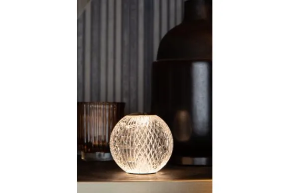 Tafellamp Cintra van het merk Lucide brengt je het hele jaar door een sprankel vreugde in je woning. De tafellamp gaat met gemak tot 32 uren lichtplezier mee. Verplaats deze schemerlamp met accu moeiteloos in je huis en geef hem een plaatsje op je eet- of salontafel, commode of nachtkastje. De transparante bol bevat speelse groeven die doen denken aan kristal. Dim de geïntegreerde ledlamp voor maximale sfeer. De lamp heeft een diameter van 11 centimeter. Combineer deze tafellamp met messing accessoires en geef een extra toets gezelligheid aan je interieur.