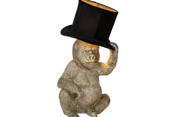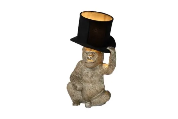 Tafellamp Extravaganza GustĀ brengt een vleugje humor binnen in je woonkamer, slaapkamer of bureau. Op een stijlvolle manier bovendien. De kunststoffen gorilla – zeg gerust Gust – reikt met zijn linkerhand omhoog om je goedendag te knikken met zijn hoed. Niet zomaar een hoed. Binnenin de hoed zit de lamp verscholen. De open top geeft het licht vrij spel naar boven, net zoals de ruimte tussen het hoofd van de gorilla en de hoed zelf de lichtstralen naar beneden verspreidt. Zet deze extravagante verlichting aan via de schakelaar op het snoer en vlij je gezellig neer. Gorilla Gust geeft alvast het goede voorbeeld.