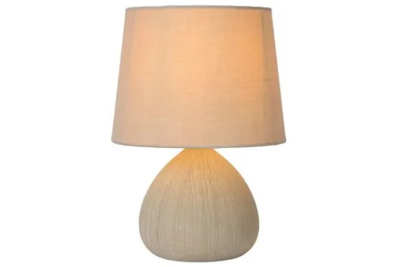 Tafellamp Ramzi van het merk Lucide combineert een strak ontwerp met natuurlijke materialen. De keramieken voet heeft een afgeronde vorm en een lichte structuur die zorgt voor een rustige, eigentijdse uitstraling.