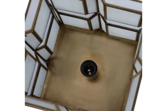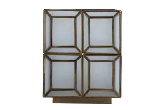 Tafellamp Layra van het merk PTMD is een handgemaakt designstuk dat luxe en karakter uitstraalt. De geometrische glasvlakken, omlijst met antiekkleurig metaal, zorgen voor een stijlvol lijnenspel en een verfijnd spel van licht en reflectie.