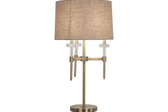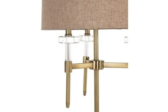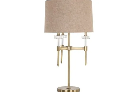 De goudkleurige metalen basis met kirstalaccenten geeft de lamp een chique en glamoureuze look. De ronde voet maakt het geheel luchtig en verfijnd.