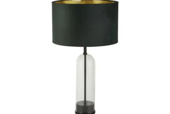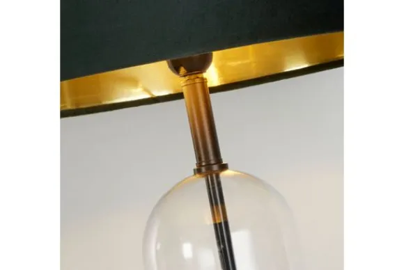 Tafellamp Oxford EU81711GR van het merk Searchlight is een luxueuze lamp met een zwart voetstuk van marmer dat in een glazen stolp zit. De lampenkap is van donkergroen velvet, de binnenkant is goud gekleurd voor een elegant effect.
