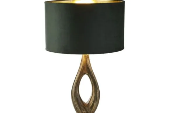 Tafellamp EU86531GR Bucklow van het merk Searchlight heeft een voetstuk gemaakt van brass. De lampenkap is gemaakt van donkergroen velvet.