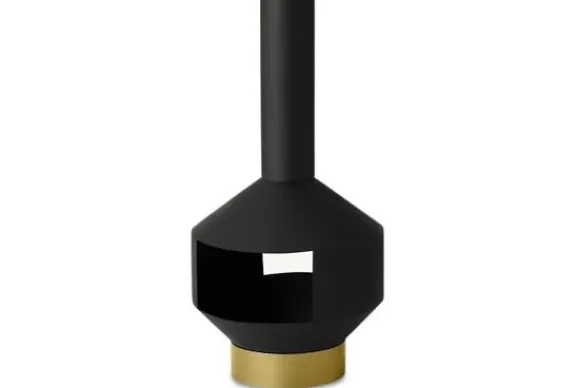 De combinatie van matzwart metaal en een elegante gouden basis geeft deze buitenhaard een uitgesproken stijlvol tintje dat perfect past in een modern of hotel chic tuinconcept.