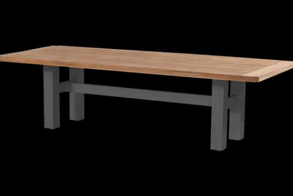 Het tafelblad is vervaardigd uit teakhout.