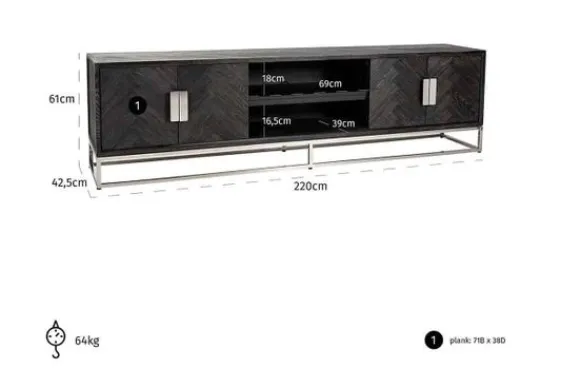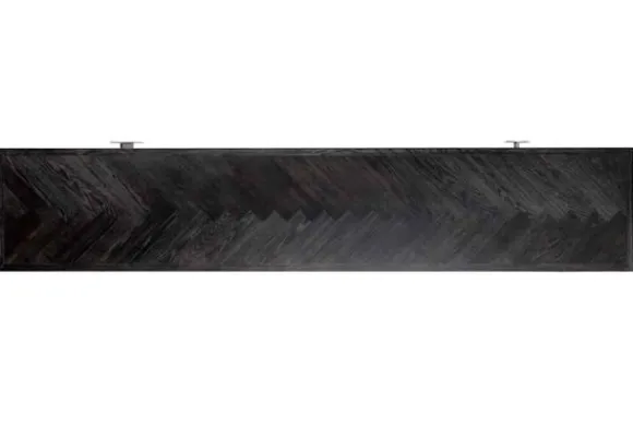 Tv-dressoir Blackbone 210230 van het merk Richmond Interiors is een elegante, maar toch ook een stoer tv-dressoir. Het tv-dressoir is gemaakt van eiken fineer, waarvan de delen in een chique visgraatmotief zijn gelegd. Het strakke onderstel is gemaakt van verchroomd staal. Het tv-dressoir heeft vier deuren waar in totaal vier vakken achter zitten om al je spullen netjes op te kunnen bergen. In het midden bevinden zich twee open vakken om onder andere tv accessoires neer te zetten.
