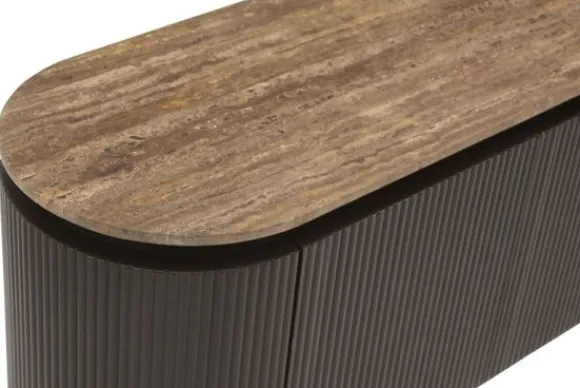 Tv-meubel Russo is vervaardigd uit MDF met een travertin blad dat een subtiel patroon laat zien, waardoor elk exemplaar uniek is. Dit samenspel van materialen creëert een harmonieus geheel dat moeiteloos past in verschillende interieurs.