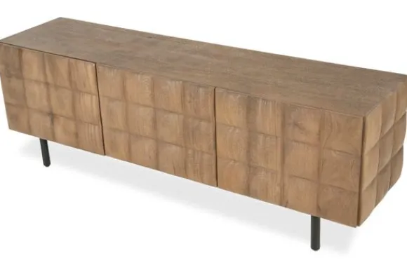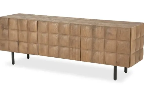 Tv-meubel Felix 96369 van het merk Eleonora is een stijlvol samenspel van ambacht en eigentijds design. Het warme mangohout is uitgevoerd in een natuurlijke bruine tint die de rijke houtnerf prachtig tot zijn recht laat komen. Wat meteen opvalt, is het verfijnde reliëfpatroon op de frontpanelen. Een kubistisch spel van diepte en schaduw dat elke lade een bijna sculpturale uitstraling geeft. Alsof licht en textuur met elkaar in dialoog gaan. De strakke, zwarte poten van gepoedercoat ijzer tillen het geheel letterlijk naar een hoger niveau en zorgen voor een luchtige, moderne touch.