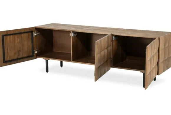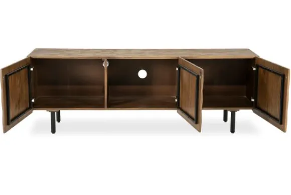 Het contrast tussen het warme hout en het industriële onderstel creëert een perfecte balans tussen robuust en elegant. Dit tijdloze meubelstuk biedt niet alleen visuele kracht, maar ook praktische opbergruimte voor elektronica, accessoires en meer. Ideaal voor een strak georganiseerde en sfeervolle woonkamer.