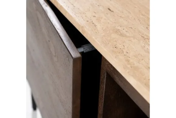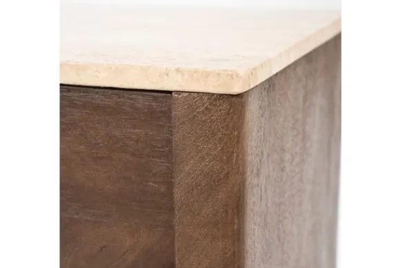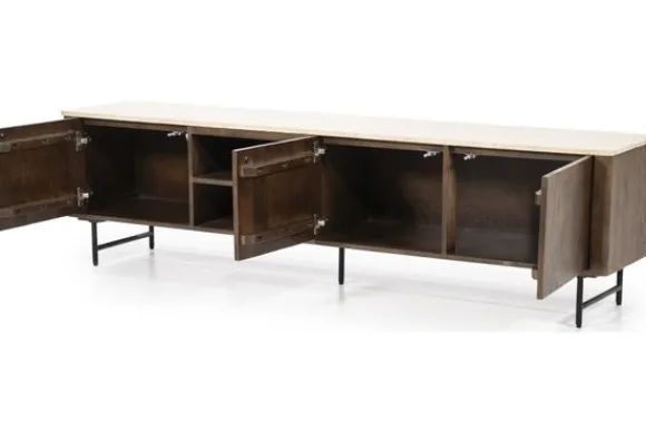 Het tv-meubel is gemaakt van mangohout. Dit hout heeft zichtbare kleurschakeringen en natuurlijke verschillen in het oppervlak. Mangohout is stevig en geschikt voor dagelijks gebruik. Het blad boven de deuren is uitgevoerd in travertin. Dit is een natuursteen in een lichte beige tint met kleine open structuren. Travertin is sterk en eenvoudig schoon te maken met een licht vochtige doek.