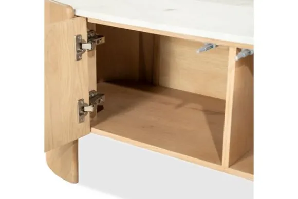 Het witte marmeren blad vormt een stijlvol contrast met het lichte hout en reflecteert subtiel het licht, alsof er een zweem van rust over het meubel ligt. De greeploze deuren zorgen voor een strak silhouet en verbergen praktische opbergruimte voor apparatuur, kabels of woonaccessoires.