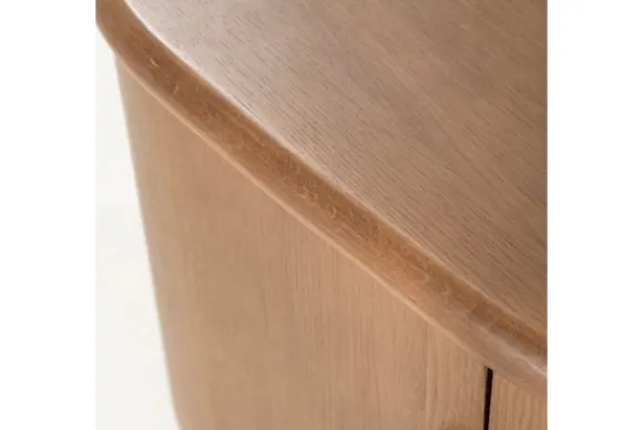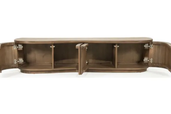 De volledig ronde afwerking van de hoeken en het blad zorgt voor een vriendelijk en zacht uiterlijk. Deze vormgeving maakt het tv-meubel prettig om naar te kijken en gemakkelijk te plaatsen in verschillende woonruimtes. Het geheel oogt rustig en evenwichtig zonder te overheersen.