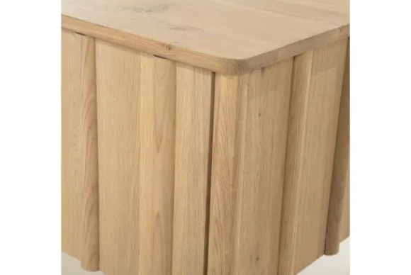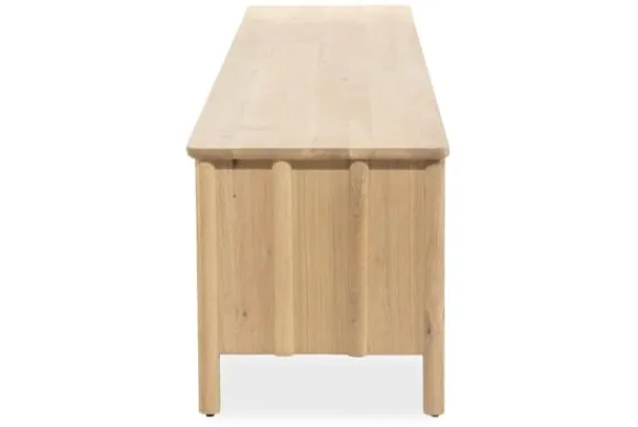 Het tv-meubel is gemaakt van massief eikenhout en eiken fineer. De naturel afwerking laat de houtnerf en kleurnuances goed zichtbaar. De zes deuren zijn uitgevoerd met een lamelpatroon dat zorgt voor een strak en gelijkmatig lijnenspel. Afgeronde hoeken en slanke poten geven het meubel een verzorgde en luchtige opbouw.