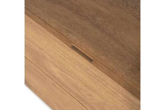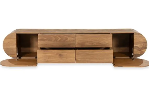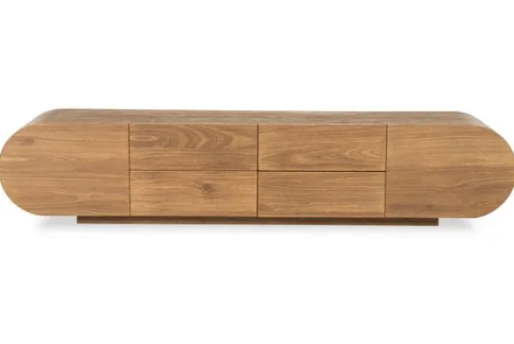 Het tv-meubel is gemaakt van mangohout en mango fineer. Het hout is geborsteld afgewerkt waardoor de nerfstructuur goed zichtbaar blijft. De afgeronde zijkanten en rechte fronten zorgen voor een vloeiende vorm die makkelijk te combineren is met andere meubels.