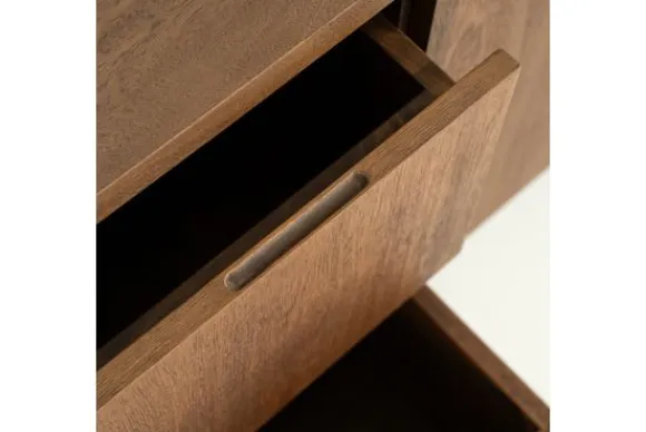 Tv-meubel Edward 96429 van het merk Eleonora is een toonbeeld van rustige luxe en moderne eenvoud. Gemaakt van een combinatie van massief mangohout en mango fineer, straalt dit meubelstuk warmte en vakmanschap uit. De geborstelde afwerking accentueert de natuurlijke houtnerf en geeft het oppervlak een subtiele textuur die zowel visueel als tactiel verrijkt.