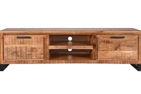 Tv-meubel Glasgow RF-37.120 van het merk Label51 is met zijn ruwe mango houten oppervlaktes, gecombineerd met zwart metalen sledepoten een stoer en industrieel meubel.Tv-meubel Glasgow, uitgevoerd in de kleur rough is gemaakt van ruw, duurzaam mangohout. Glasgow heeft een bijzondere, individuele uitstraling door de unieke draad van het hout.