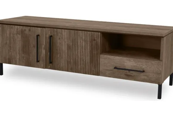 Het Napoli tv dressoir beschikt over twee deuren met daarachter een legplank, één open vak en één lade. Deze indeling biedt ruimte voor apparatuur, accessoires en kabels. De deuren en lade zijn afgewerkt met smalle zwart metalen handgrepen en voorzien van softclose dempers voor een soepele en stille sluiting.