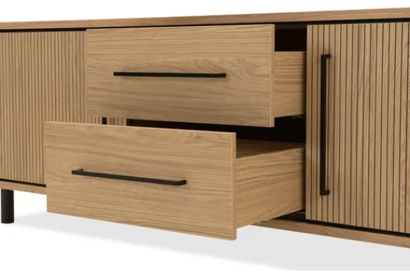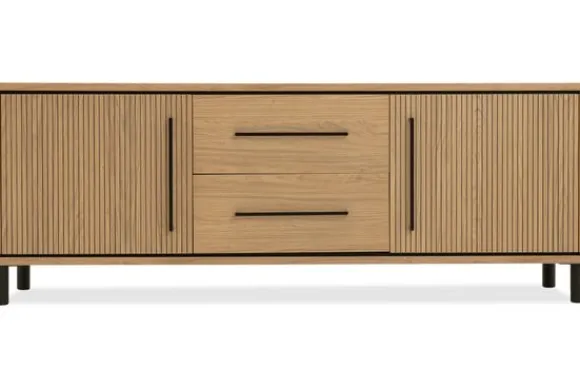 Tv-meubel Bromley van het merk Lamulux is een stijlvol meubel met een warme en hedendaagse uitstraling. De uitvoering in melamine met de kleur blond oak geeft het meubel een natuurlijke houtlook. Het tv meubel biedt praktische opbergruimte voor apparatuur en accessoires.