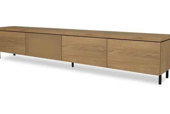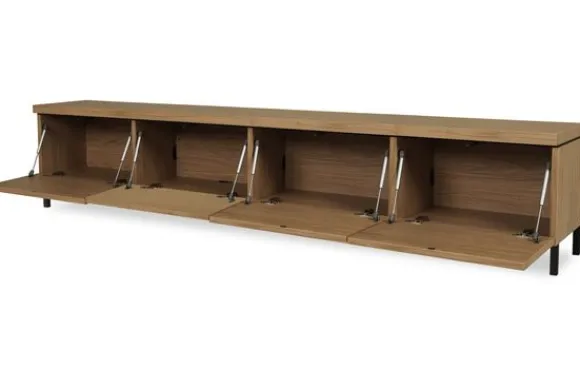 Het tv-meubel heeft standaard een klepdeur en één speakerdoek. Je kunt optioneel kiezen voor een extra speakerdeur. De deuren zijn te openen met een push to open systeem. Dit zorgt voor een strak uiterlijk dat goed aansluit in een modern of Scandinavisch interieur.