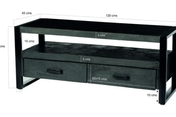 Het tv meubel is voorzien van twee lades voor het opbergen van spullen. Daarboven bevindt zich één groot open vak, geschikt voor media apparatuur of decoratie.