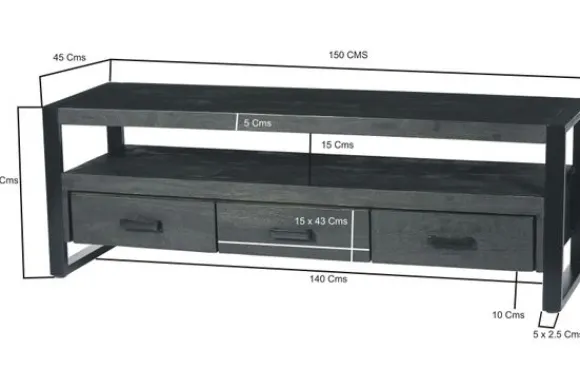 Het tv meubel is voorzien van drie lades voor het opbergen van diverse spullen. Daarboven bevindt zich één groot open vak, geschikt voor media apparatuur of decoratie.