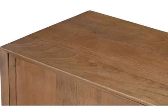 Tv-meubel Ravenstein van het merk Livingfurn is gemaakt van mangohout en geeft een strakke, minimalistische look aan de ruimte. De greeploze deuren en open vakken bieden zowel een minimalistische uitstraling als praktische opbergruimte voor media-accessoires en decoratieve eyecatchers.
