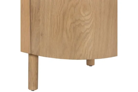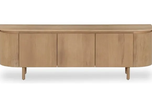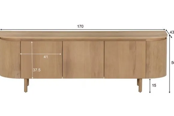 TV-meubel Tobago van het merk Livingfurn brengt een gevoel van lichtheid en natuurlijke rust in de woonkamer. Het naturel MDF-fineer benadrukt de zachte houtstructuur en geeft het meubel een frisse, organische uitstraling. De afgeronde hoeken en greeploze deuren zorgen voor een vloeiende, minimalistische vormgeving die rust uitstraalt zonder aan elegantie in te boeten.