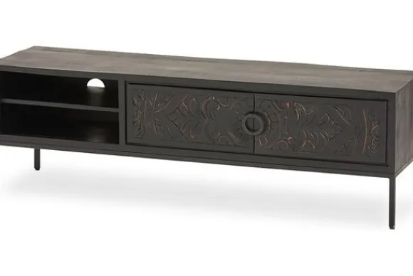 Tv-meubel Carving CRV.TV.0005 van het merk MySons straalt elegantie en vakmanschap uit en is een absolute blikvanger in elke woonkamer. Het meubel is vervaardigd van massief mangohout in de prachtige kleur Black Antique, die een warme en tegelijkertijd stoere uitstraling geeft. Mangohout kun je herkennen aan de vele kleurschakeringen en ongelijkheden in het oppervlakte van het hout, waardoor geen enkel meubelstuk hetzelfde is. De kleuren in mangohout kunnen variëren van licht- tot donkerbruine tonen, met soms een rode gloed of juist een gelige ondertoon. Mangohout is een duurzaam houtsoort.