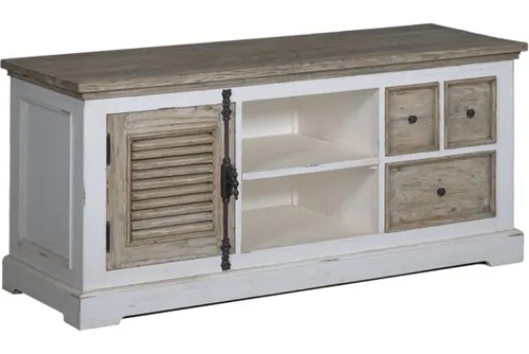 Tv-meubel Amanda TD 0017 van het merk Tower Living is gemaakt van hergebruikt grenen. Het geleefde hout geeft deze kast een romantische en landelijke uitstraling. Je kunt dit hout makkelijk schoonmaken met een zachte vochtige doek. Deze kast heeft diverse opbergmogelijkheden, namelijk twee open vakken, drie lades en één deur.
