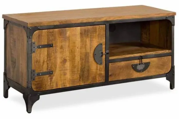 Tv-meubel Basto IF 1091B van het merk Tower Living is een krachtig vormgegeven meubel dat stoer en verfijnd moeiteloos combineert. Vervaardigd uit massief mangohout met zichtbare houttekeningen en afgewerkt met zwart metalen details, brengt dit meubel een levendige structuur in de ruimte. De afgeronde hoeken van het metalen frame verzachten het industriële karakter en geven het geheel een hedendaagse uitstraling.