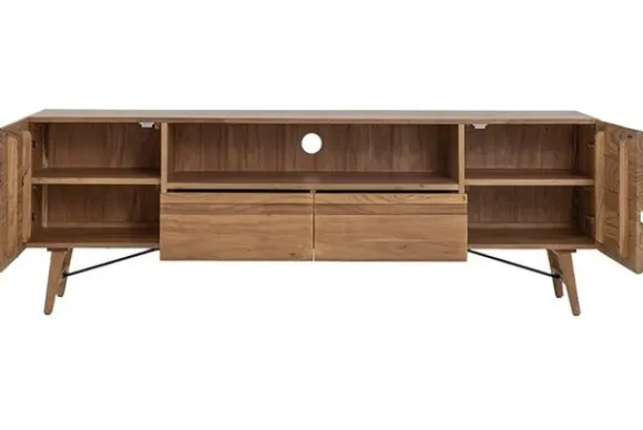 De twee deuren aan de zijkant, twee lades en het open vak bieden voldoende opbergruimte voor apparatuur, afstandsbedieningen en decoratieve objecten. Met het ingebouwde kabeldoorvoergat werk je snoeren eenvoudig weg.
