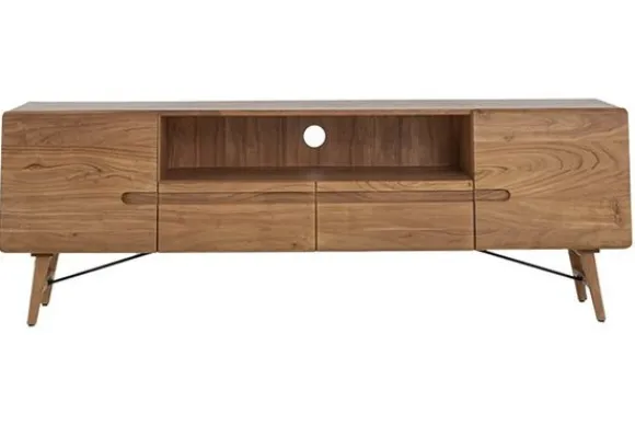 Tv-meubel Aura VF 0012 van het merk Tower Living in de kleur naturel is vervaardigd uit hoogwaardig acaciahout. Deze duurzame en harde houtsoort staat bekend om zijn lange levensduur en warme uitstraling. Het unieke nerfpatroon geeft ieder meubelstuk een eigen karakter.