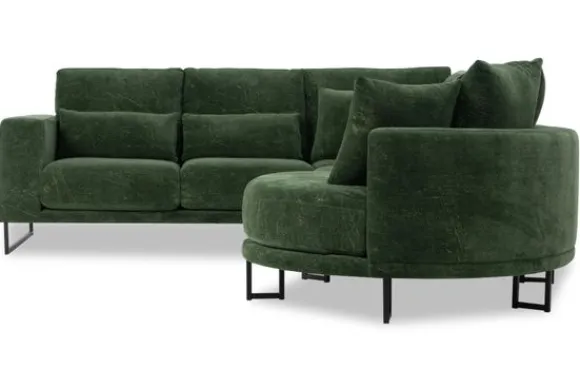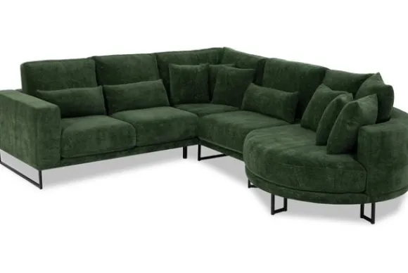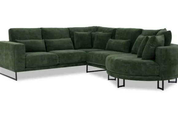 Hoekbank Dordoni II van het merk Be Inspired is verkrijgbaar in alle kleuren en in verschillende materiaalsoorten zoals ribstof, teddy en velvet. Je kunt kiezen uit diverse afmetingen. De Dordoni II bank wordt standaard uitgevoerd met alle sierkussens en lendekussens die ook op de foto te zien zijn. De rugkussens daar achter zijn lekker hoog, deze combinatie zorgt voor een goede ondersteuning van de rug. Alle rugkussens zitten los en zijn omkeerbaar, de zitkussens zitten vast met klittenband. Het unieke aan de Dordoni II is het ronde loungegedeelte. Je kunt hier lekker wegkruipen tussen alle sierkussens. Deze bank oogt ruimtelijk door de hoge metalen sledepoten.