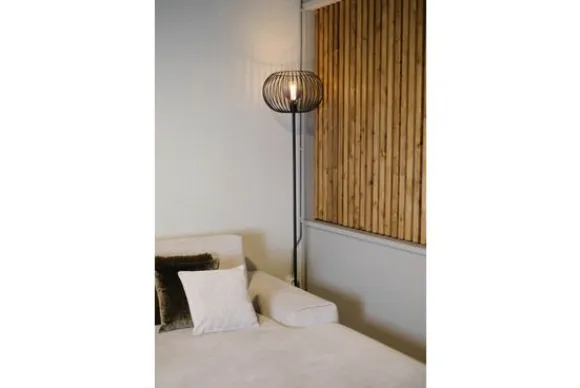 Vloerlamp Bolato – Lucca van het merk Highlight is een stoere vloerlamp gemaakt van draadmetaal. Doordat deze lamp open is, oogt de lamp ruimtelijk en kan je de lichtbron zien. Ook creëert deze lamp een mooi lichteffect. Het metalen frame is matzwart.
