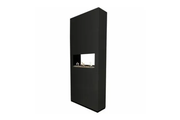 De haard is een vrijstaande haard en daarom zeer geschikt als room-divider. Het ontwerp van dit model geeft een mooie doorkijk waarbij het vuurbeeld van de voor- en de achterzijde te zien is. De ombouw is aanpasbaar in hoogte 156, 206 of 256 cm. De ombouw wordt standaard uitgevoerd in de kleur Ral 9005, maar de kleur is ook mogelijk. Ook is deze haard mogelijk als “”.
