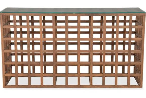 Wandtafel Heras 96576 van het merk Eleonora is uitgevoerd in mangohout met een rechthoekig glazen blad. De open structuur bestaat uit een strak raster van houten vakken. Het glazen blad ligt los op het frame en heeft een transparante afwerking. De warme houtkleur laat een natuurlijke nerf zien. Dit zorgt voor een stabiele en stevige constructie.