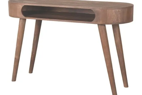 Bureau Bella AC-49.083 van het merk LABEL51 is een stijlvol bureau met ronde vormen en slanke poten. Het mangohout in een diepe espresso kleur brengt warmte en karakter in elke werkomgeving. Daarbij zorgt het open vak aan de voorkant voor extra opslagruimte.