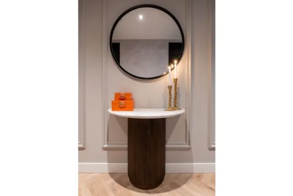 Wandtafel Mayfield 211820 van het merk Richmond Interiors is vervaardigd uit een wit marmeren blad en donkerbruine mangohouten poten. Marmer is een duurzame steensoort en heeft een luxe en stijlvolle uitstraling. De steensoort is een natuurproduct en kenmerkt zich door de unieke afwerkingen en kan zowel grove als gladde delen bevatten. Door de kenmerkende kleurschakeringen en aders is geen product hetzelfde. Zo haal je met een marmer product dus echt iets unieks in huis. Mangohout kun je herkennen aan de vele kleurschakeringen en ongelijkheden in het oppervlakte van het hout, waardoor geen enkel meubelstuk hetzelfde is. De kleuren in mangohout kunnen variëren van licht- tot donkerbruine tonen, met soms een rode gloed of juist een gelige ondertoon. Mangohout is een duurzame houtsoort. De poot heeft een geribbelde structuur in combinatie met brass (staal in mat goud) pootrand, dat zorgt voor een stoere uitstraling. De wandtafel is perfect voor kleinere ruimtes, zoals de hal.