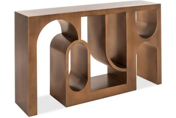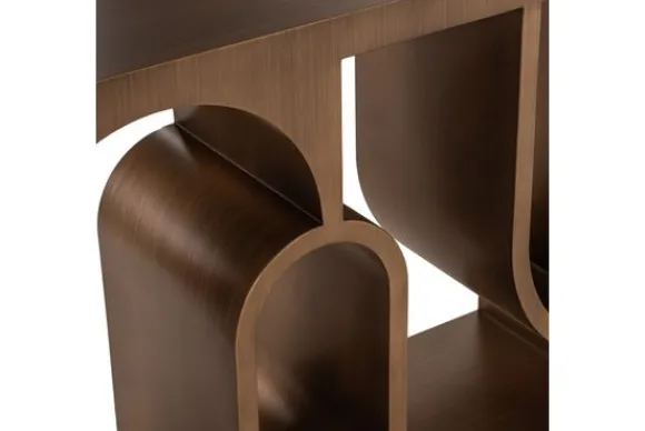 Wandtafel Lugano 213498 van het merk Richmond Interiors is een artistiek vormgegeven pronkstuk met een speels lijnenspel. De tafel is volledig uitgevoerd in geborsteld bronskleurig metaal en straalt pure elegantie uit. De uitgesneden bogen, ovalen en U-vormen creëren een fascinerend ritme van licht en schaduw, alsof het ontwerp in beweging is.