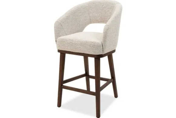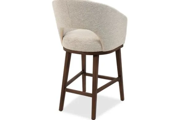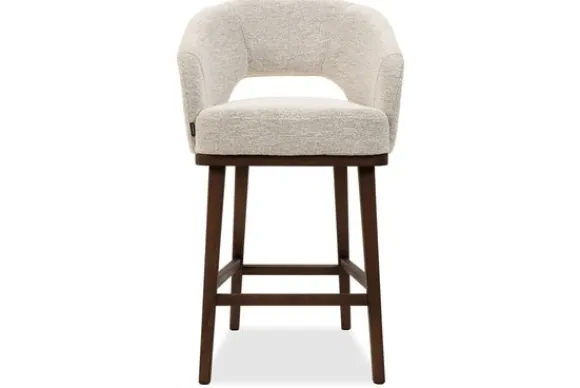 De barkruk is leverbaar in verschillende stoffen en afwerkingen, waaronder zachte velours, slijtvaste bouclé en onderhoudsvriendelijk kunstleer.