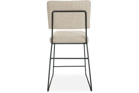 Deze uitvoering heeft armleuningen en een gladde rugleuning. Het smalle frame en de open ruimte tussen zitting en rugleuning zorgen voor een ruimtelijke uitstraling. De poten zijn uitgevoerd in zwart gepoedercoat metaal.