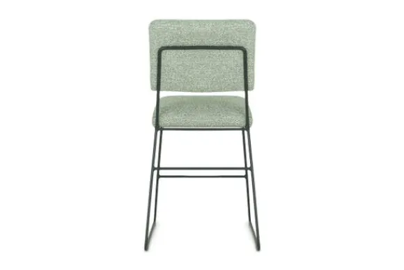 Deze uitvoering zonder armleuningen heeft een smal frame en een open ruimte tussen zitting en rugleuning, wat zorgt voor een ruimtelijke uitstraling. De poten zijn uitgevoerd in zwart gepoedercoat metaal.