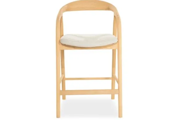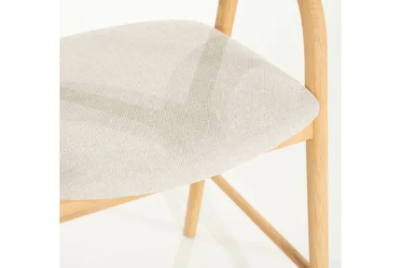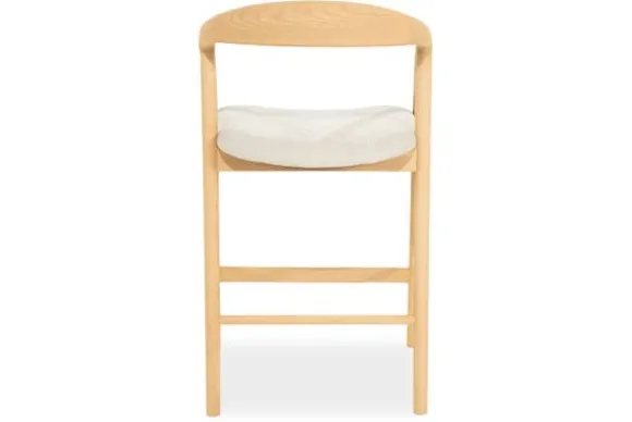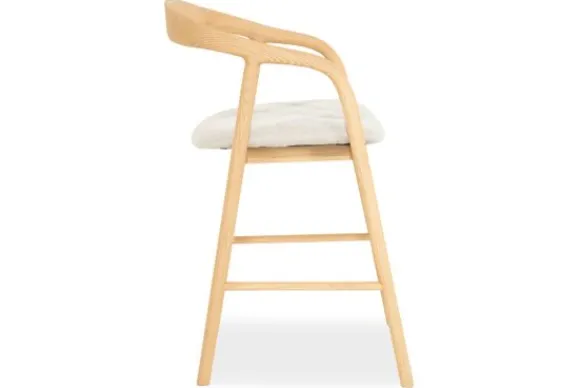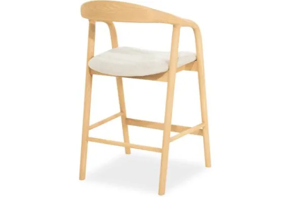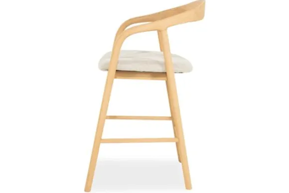 Barkruk Rayven 96355 naturel van het merk Eleonora is een tijdloos en elegant meubelstuk dat een verfijnde balans biedt tussen Scandinavische eenvoud en hedendaags comfort. Het frame van gelakt essenhout toont een subtiel spel van natuurlijke nerven en zachte rondingen. De rugleuning vloeit moeiteloos over in de armsteunen, wat zorgt voor een uitnodigende, organische vormgeving. Het lichte hout straalt warmte en rust uit. De zitting is bekleed met een zachte, neutrale stof die niet alleen comfort biedt, maar ook visuele zachtheid toevoegt. Dit contrast tussen textiel en hout creëert een boeiende dialoog tussen structuur en zachtheid.